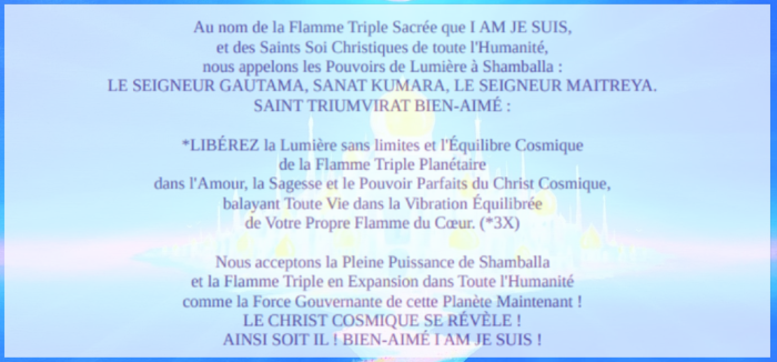Lorsque vous décidez d’arrêter : Vous pouvez mettre une des musiques clef-tonales ci-dessous Absorption des Flammes position debout « Bien-Aimées Flammes Bénies, expressions de l’Essence Lumineuse de la Présence I AM "Je Suis" nous Vous rendons grâce et Vous demandons humblement de retourner dans le Coeur Central de la Création en attendant d’être à nouveau appelées à l’action par l’invocation de l’Humanité, afin que s’élargissent à l’infini les frontières du Royaume du Père ! Nous prenons conscience de l’Unité de toute Vie et nous nous inclinons humblement devant la Lumière Cosmique et devant notre Merveilleuse et Bien-Aimée Présence I AM « Je Suis » ! Celle du Père (éteindre la bougie bleue), du Fils (éteindre la bougie jaune), et du Saint-Esprit (éteindre la bougie rose). " MERCI, c'est accompli !" (éteindre avec un petit couvercle sans souffler la bougie)