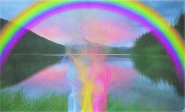Peinture de l'auteur représentant notre Présence supérieure dans son Corps électronique de Feu Blanc, entourée du "Corps Causal" cercles colorés des dynamiques accumulées aux cours des âges et la "corde d'argent" alimentant les sept chakras ou centres spinnaux par le coeur du corps atomique. Avec ou sans le "Je" Christique. Explications de la Charte plus détaillées ici